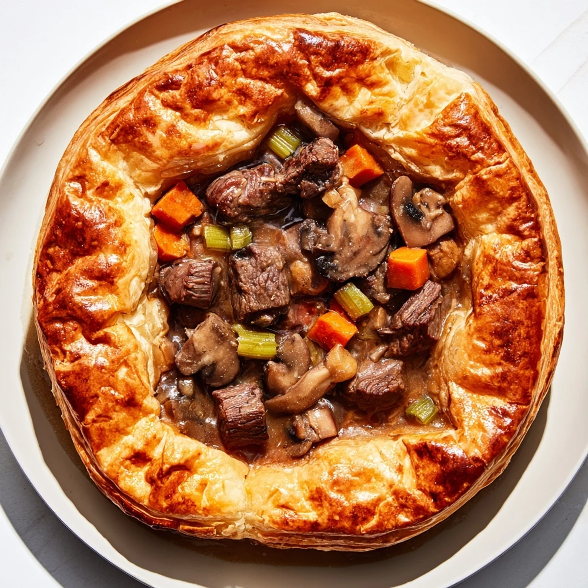Cette tarte allie une croûte dorée et croustillante à un cœur riche de morceaux de bœuf tendres, accompagnés de légumes mijotés et d'une sauce savoureuse épaisse. La préparation commence par le brunissage du bœuf suivi d'une cuisson lente avec carottes, céleri, champignons, oignon, ail et épices, qui créent une farce parfumée. L'ensemble est surmonté d'une pâte feuilletée dorée, apportant une texture croustillante. Ce plat réconfortant se déguste chaud, idéal pour un déjeuner ou dîner copieux en famille.