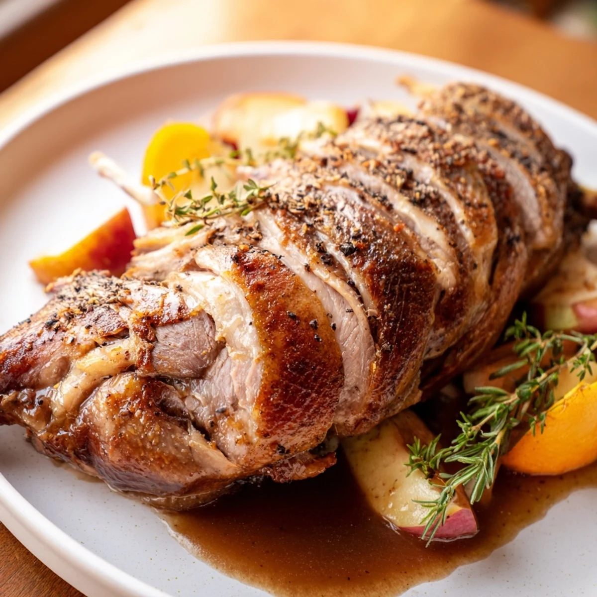 Un plat classique de fête composé d'une oie succulente avec une peau croustillante, des herbes aromatiques et une sauce riche et savoureuse—parfait pour les occasions spéciales ou les repas de fête.