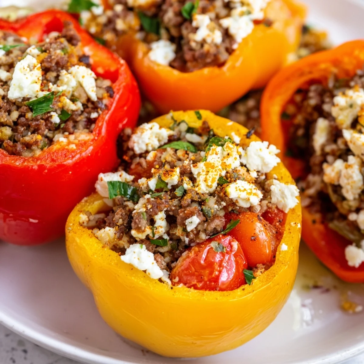 Ce plat associe des poivrons colorés, farcis d'un mélange de boeuf haché, de riz et d'herbes méditerranéennes comme le persil, la menthe et l'origan. Les ingrédients sont délicatement sautés puis cuits au four pour révéler toutes leurs saveurs, avec une touche de feta pour apporter du fondant. Parfait pour un repas complet, il offre une belle harmonie entre les légumes, les protéines et les épices traditionnelles de la Méditerranée. Simple à préparer, il demande environ 1 heure et s'adapte facilement selon vos envies et régimes alimentaires.